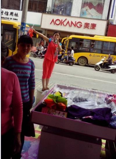 督导穿着自己店里的时尚家居睡衣站在凳子上喊麦,吸引了街上和对面很多人......
