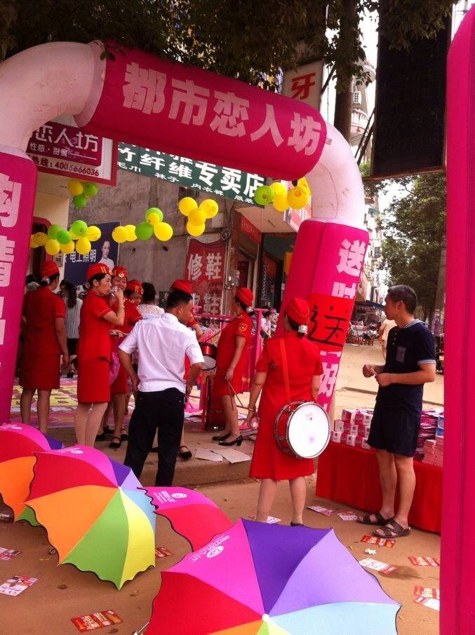 由于没有城管太多的管制,所以外场做得很大,黄丹很轻松熟练地安排,弟弟听从指挥很卖力的布置,气球从门口一直挂到了马路边的树上,拱门与氢气球条幅也都摆到了马路上,大大地门板上,礼品堆得像山一样,看着就很吸引人,黄丹高声地喊着麦,尽量地靠向马路中间,挥动着手中的传单,像指挥棒一样,引领着人潮从马路的各个方向流到这里。