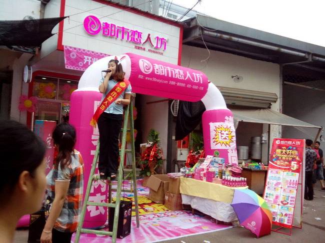 早上6:30到店面布置外场地胶、拱门、音响、花篮、礼炮,差不多布置好时我们就拿出我们的独门绝技“激情喊唛”