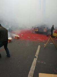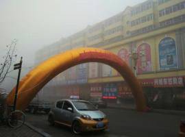 连大型吊车都用来挂爆竹了,可见店主对这个店的重视程度是多么的用心。
