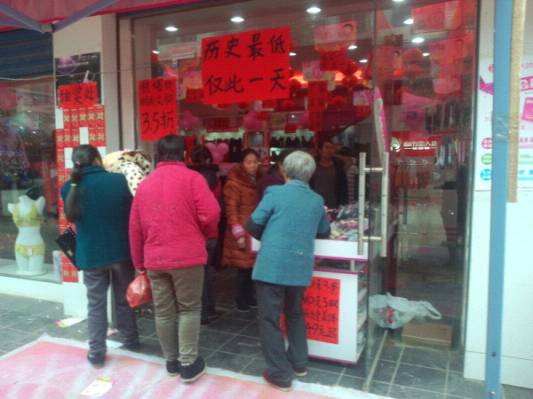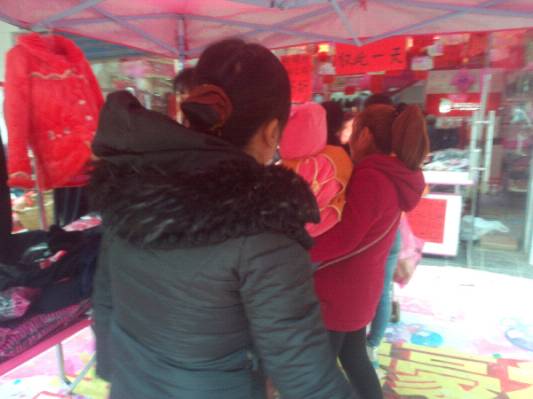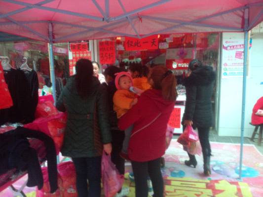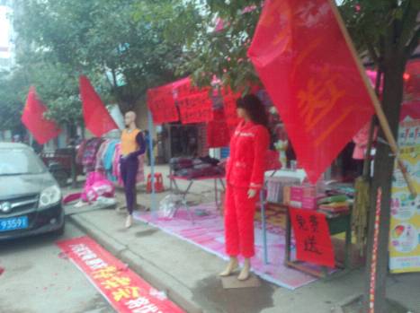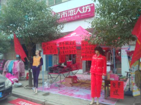 经过三四个小时的车程,到达刘姐的店里已是下午3点多了,刘姐是我们的老加盟商了,已有两年多的时间了,目前已发展到第五家店了,经过与刘姐的交流,发现刘姐是一个大气、实在的人,为了把这场活动做好,做了一个红色的旗子,绑在树上,给我们的活动外场增加了具大吸引力,活动现场还在准备中已有不少客人进店了,下面来看看我们的活动现场吧:
