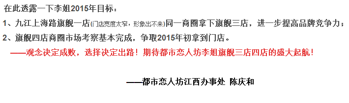 最可喜的是,2015刚开年李姐终于实现2014年许下的第一个愿望: 在九江上海路旗舰一店(门店宽度太窄,形象出不来)同一商圈拿下旗舰三店,进一步提高品牌竞争力!