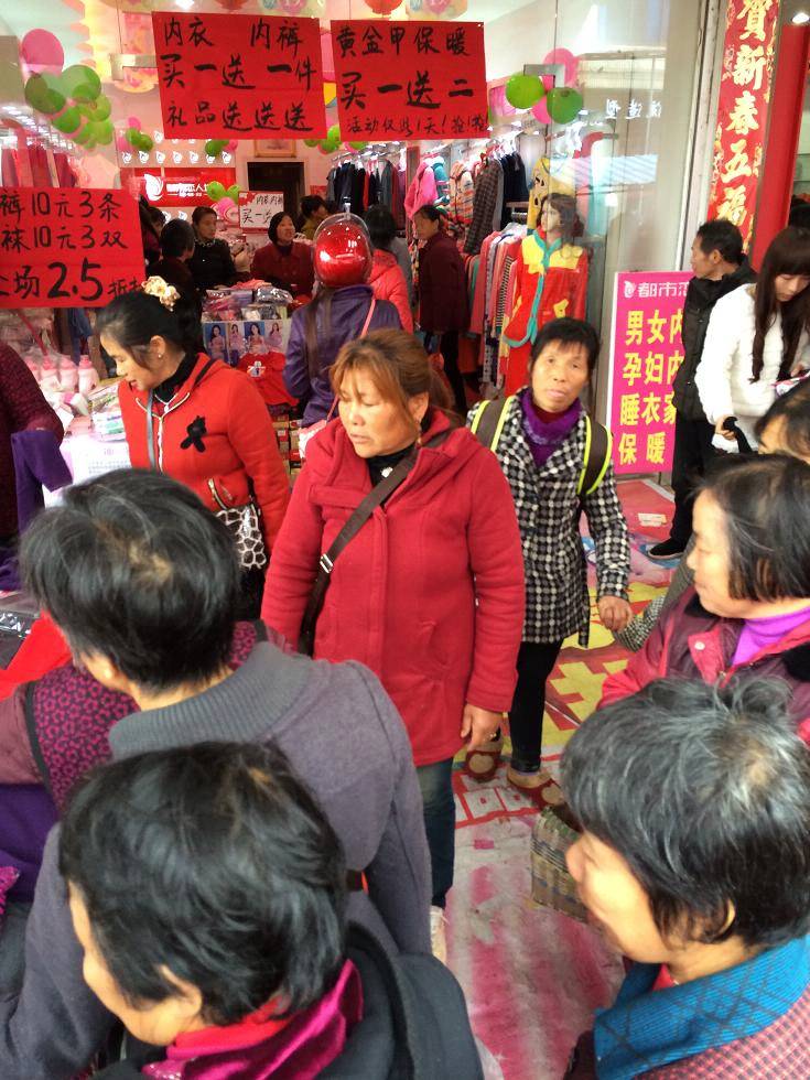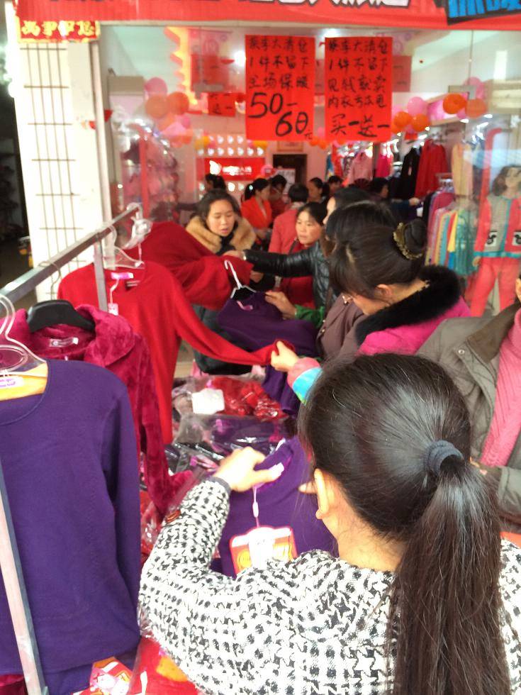 活动当天,一大早老板娘就跟说,隔壁几个镇都是今天赶集,活动效果可能会有所影响,当时我就说:不怕,尽心尽力做绝对会有成绩的。话音才一落,顾客就来了,老老少少,上到七十来岁的老人,年轻的家庭主妇,看到特价脚步快,抢抢抢!保暖清仓特卖一件不留!