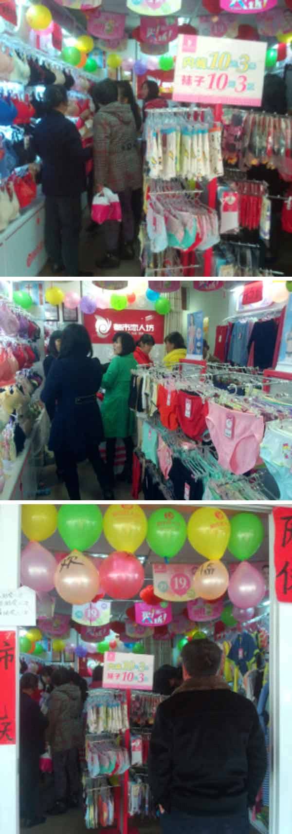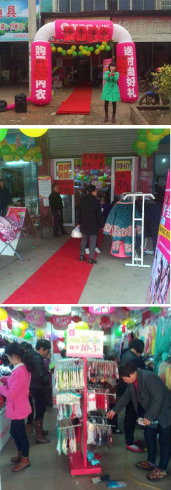 第二天一大早我们就开始活动外场,音乐还没放起来路过的行人就开始进店了,真是开心的开门红,袁家铺是一个小小镇,人口不是很多,但我们的音乐一放,喊麦声一响,店里顿时已挤满了人,今天我们的活动主题是换季清仓,是非常优惠的一次,进店的客人,有一半都拎着我们的袋子出来的,老板忙得不亦乐乎,来看看我们的活动现场吧: