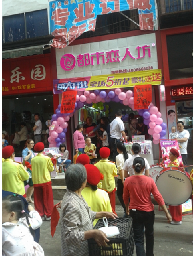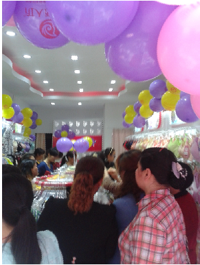 在4月4号这天,我们店终于开业了,在开业当天,我们早早的来到现场,布置内场,做拱门,摆礼品,随着我们的喊麦声锣鼓声,渐渐的人越来越多,都觉得我们的价格款式都比较适合,经过一天的努力,我们的业绩高达13169元!!下面来看一下我们火爆的场面吧!!