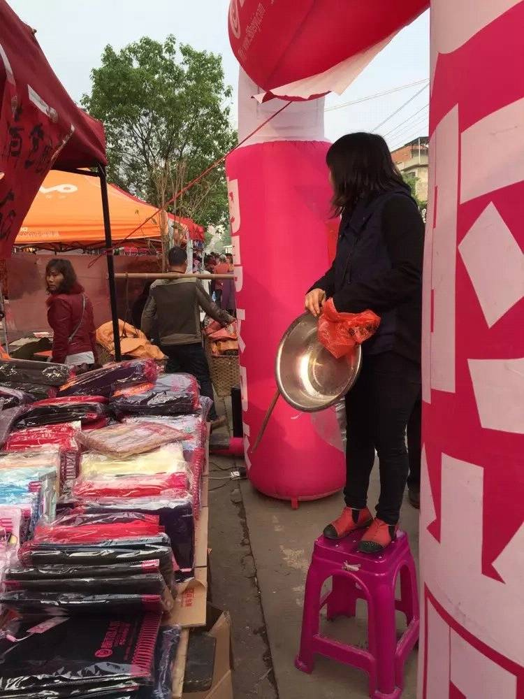 在永州珠山镇的农历3月3是很大的一个赶集,人流非常多,一早6点就开始了布场,因为王哥店铺在二楼,赶集却是在马路上,我们便把货品摆在马路边,拱门,红纸,一切布置完毕,话筒出了些小问题,可是来不及去换了,人流开始涌动,我们的老板娘太聪明了,弄了个铁盆,一根棍,敲起来,就这一举动吸引了不少人进店,就这样的喊麦,敲盆方式,开始今天的活动,