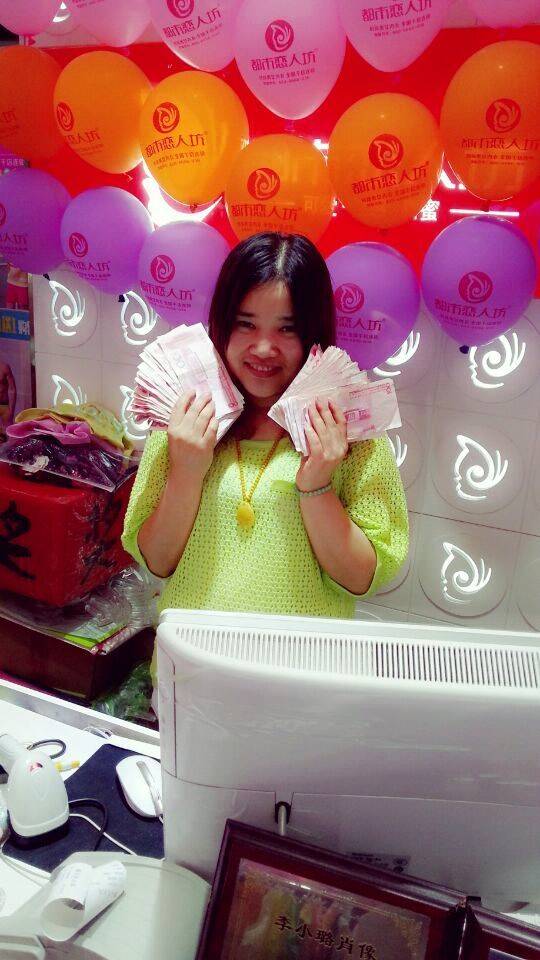 看我们美女老板是不是笑得很美呢!当然了,店面经营越来越得心应手,现在又请了两个店员,解放了自己又不耽误赚钱,轻轻松松的,苦尽甘来的感觉下怎么能笑得不灿烂呢!呵呵!加油小于!让我们一切再创辉煌!下次破两万!!!