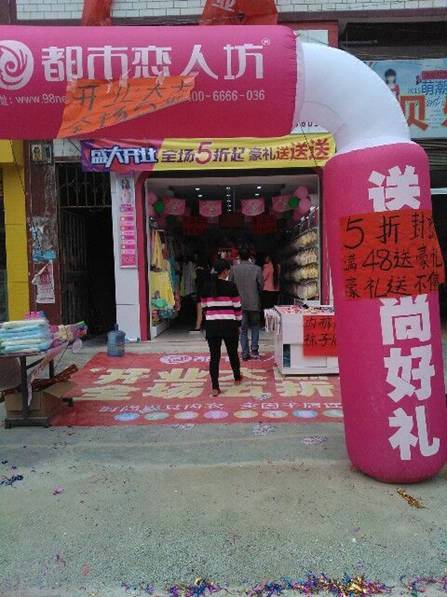 我们一行三人9月14号下午来到遵义进化镇,首先就被盛大姐的热情给感染了,可是看到新店的装修状况就感到时间紧迫,盛大姐定于9月16号开业,可是9月14号下午了柜子才安装了一般,各种货物也堆在门口,我们三个立马挽起衣袖立马开干,先组装各种中岛,先把货物陈列好了,终于在16号的早上6点钟,把我们盛大姐的新店弄得喜喜庆庆的,虽然赶集到中午12点街上就没行人了,不过在盛大姐和我们的努力下,业绩也实现了开门红,从没做过服装行业的盛大姐的开业业绩高达6428!!!