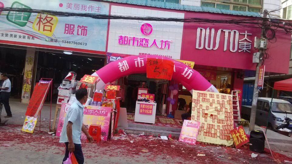 10月26日是个喜庆的日子,我们陈大哥的店隆重开业啦!!!陈大哥的朋友范大哥也是开了3家都市恋人坊开的红红火火。所以陈大哥也决定加盟我们都市恋人坊,今天终于盛大的开业了,陈大哥的店位于永州市江华县百忙营镇的的街道上店铺旁边也是陈大哥自己经营的一家鞋店。