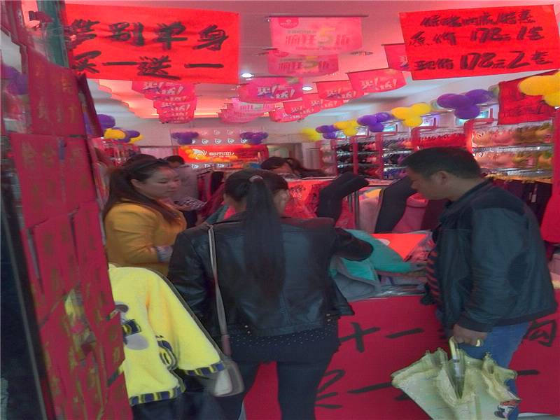 热烈祝贺谢哥双11活动业绩高达10835元!今天是11.11狂欢购物节,我们的督导和店员早早的来到店里布置,满怀信心的迎接这个购物的大好日子。可惜天公不作美,从早上开始雨就下个不停,城管更是严禁布置外场。直到上午10:30,我们的业绩才做了300块钱。大家的心里都有些着急,但是更激发了我们的好胜心。督导喊得更卖力了,店员拉人更积极了。街上的人群仿佛被我们的气氛所感染,进店的人开始络绎不绝。