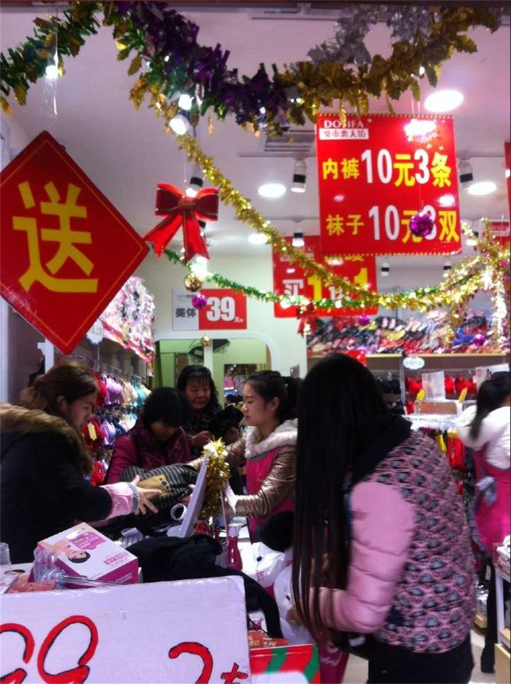 店铺货品已经准备好,音乐放起来,由于受到天气影响外面的行人比较少,有也是匆匆而过,所以我们想好对策,更要把店铺气氛带动起来,喊麦把我们的活动宣传出去,美女们也是热情的站在门口发传单,渐渐的有顾客停下脚步,来到我们的活动现场,更是被我们的产品吸引住,人都有凑热闹的习惯,渐渐的越来越多的人进来挑选,此时店里已经很拥挤了,我们督导不听的喊麦,美女导购们热情的接待顾客,一个导购同时要接待好几位顾客,忙都忙不过来。仅仅不到1个小时,我们就冲了2千业绩。这边的顾客都是一阵一阵的,一窝蜂进来,买完单都乐呵呵的走说下次还会来。趁人少了,我们又赶紧补货,收拾一下地面卫生,给顾客一个好的购物环境。我们了解这边的一个人流高峰期,做好准备又开始喊麦。开始又有顾客进来,还有上午来过的顾客介绍过来的,说明我们的产品是真正的实惠 性价比高。