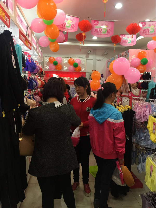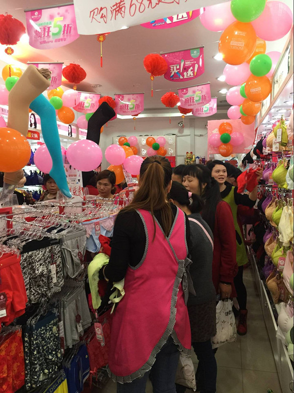 “新款文胸,睡衣低至19一件,全场购满68元送内裤一条,还可参与抽红包赢现金大奖”门前海报一挂,门边密密麻麻的红包吸引了众多女性进店抢购,一整天都是人流不断,新款文胸睡衣胜受当地人喜爱。