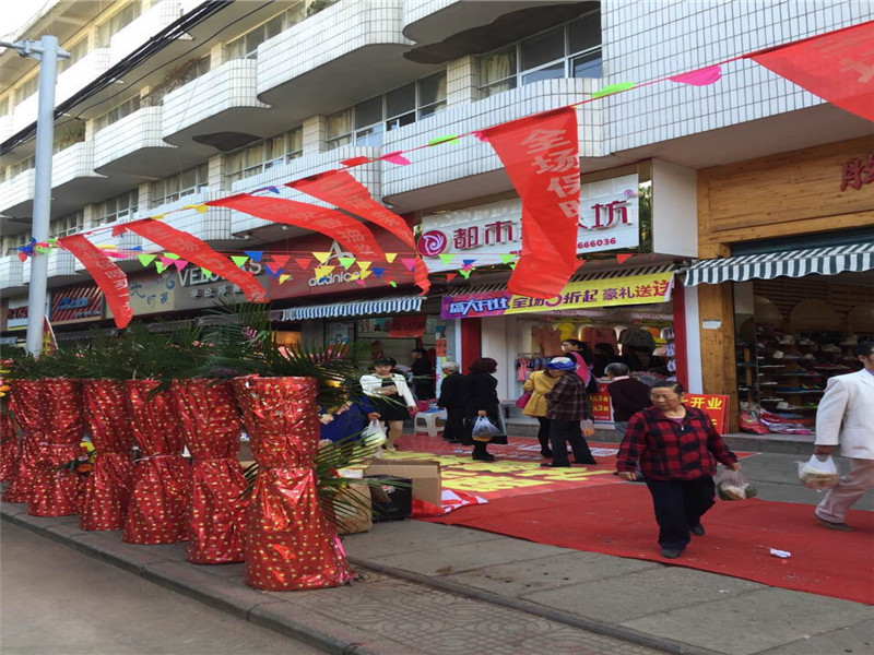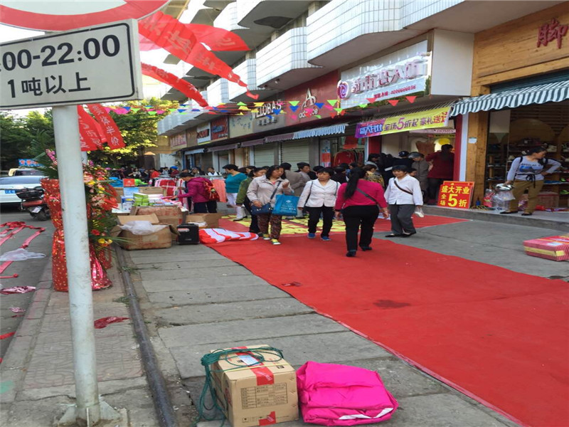 昆明东川李老板夫妻俩是湖北人,李老板是2月18日跟公司签的约,只花了短短20天不到的时间选址、装修,因为李老板夫妻俩想赶在3月8日女神节开业,为了赶在3月8日开业,公司的客服人员以及督导一直在跟踪货品的到达情况,货品终于到了,我们督导也提前一天到达店铺,为了充分的做好开业准备,为了布置一个高大上、吸引力十足的外场,我们督导们连夜赶工加班布场、挂货到凌晨5点,早上8点就开始了我们火爆的活动场面。