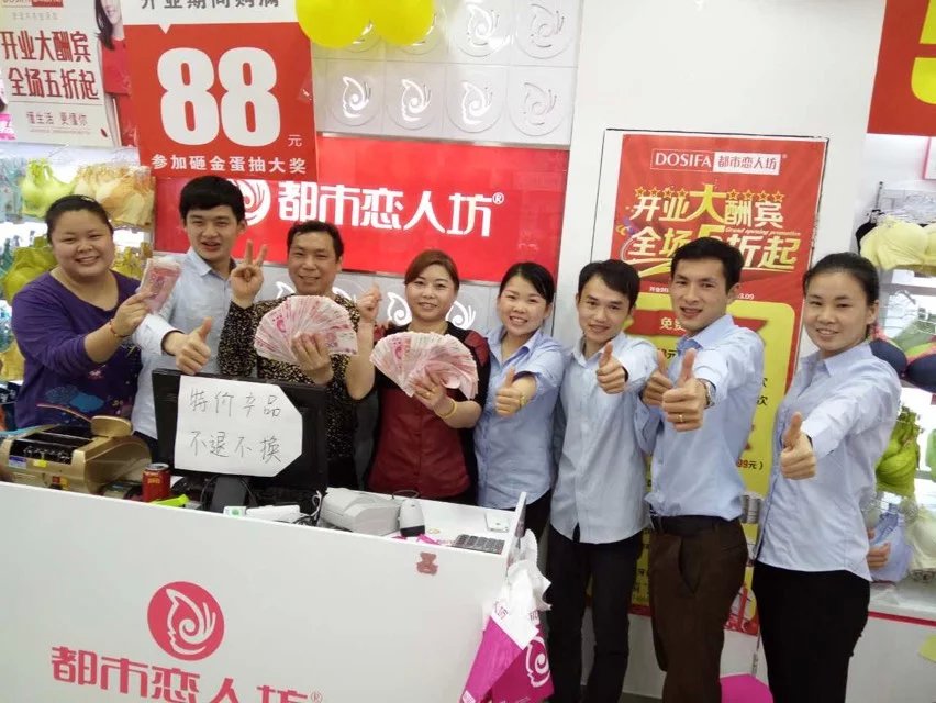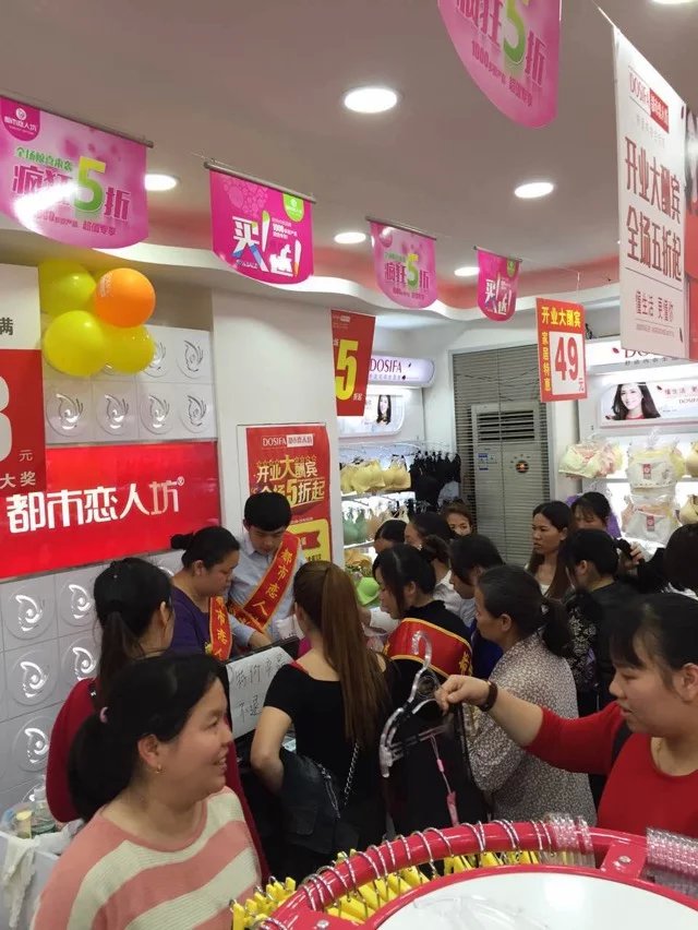 沈总是经商了十几年的生意人,他经营着鞋店与运动品牌店,由于运动品牌店这些年都不景气,一直想转型,在去年公司南宁招商中,受到公司邀请,参加了公司招商会,进一步了解公司运营模式,当场与公司签约!公司还特派专员考察所签联营店,同时,沈总亲自考察了实体店,经公司审批合格后,最后决定将运动品牌店,转型为都市恋人坊内衣品牌店,就在今年3月8号,正式开业,下图为开业场面。