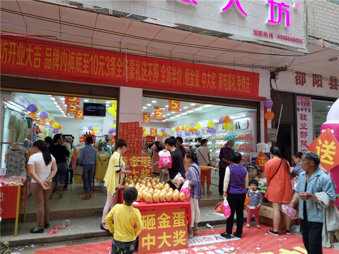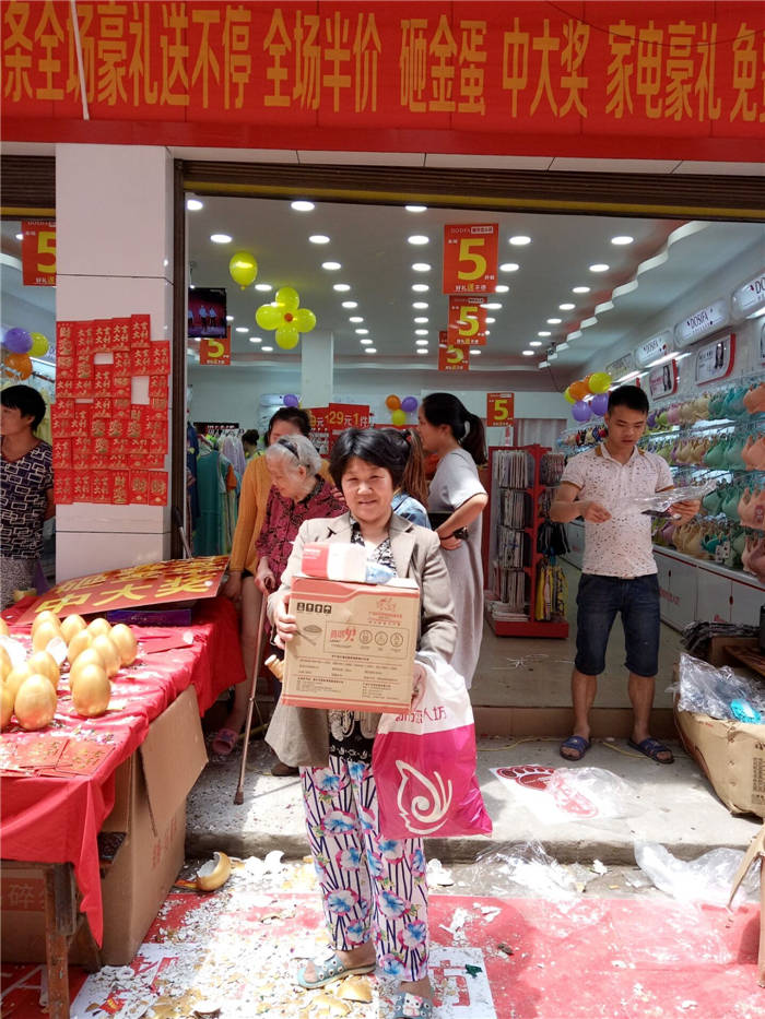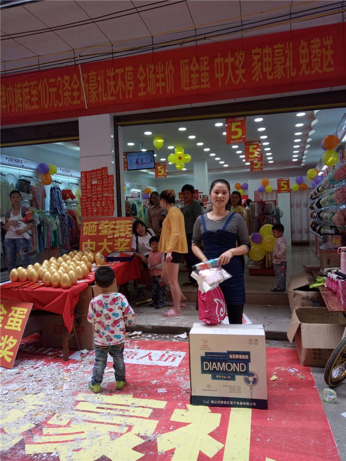 6点早早的来到店里布置着外场,摆放着我们的各种豪礼。菜场一有人随着我们的开业音乐一声声打动人心的开业优惠喊声。开业现场火爆进行中,地面上的大脚指标各个路口指引人流不断的来到我们店铺挑选。砸金蛋砸金蛋中大奖中大奖,落地扇,电饭煲直接抱回家。
