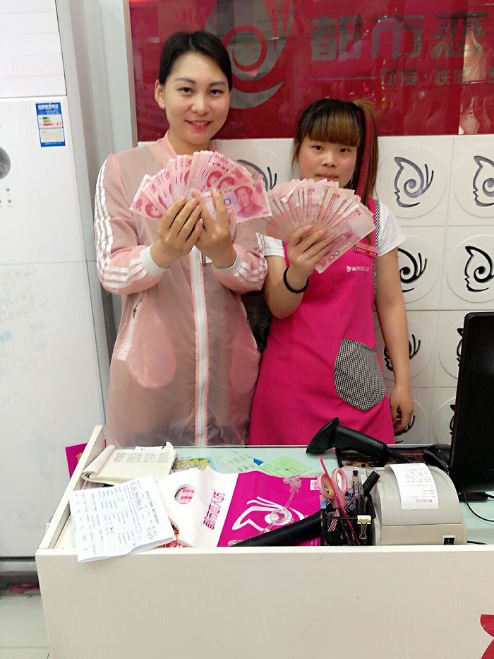 5月一个普通的周末,我们的公司督导和张总的一个店员,两个人一外激情喊唛,一内热情服务,时而内外兼并默契配合,最终胜利的果实——8985元,看到一天忙碌又充实的业绩,两个美女开心极了,老板也非常满意的对她们伸出了大拇指,说都市恋人坊五维服务和老板培训,让他无忧开店,放心管理。