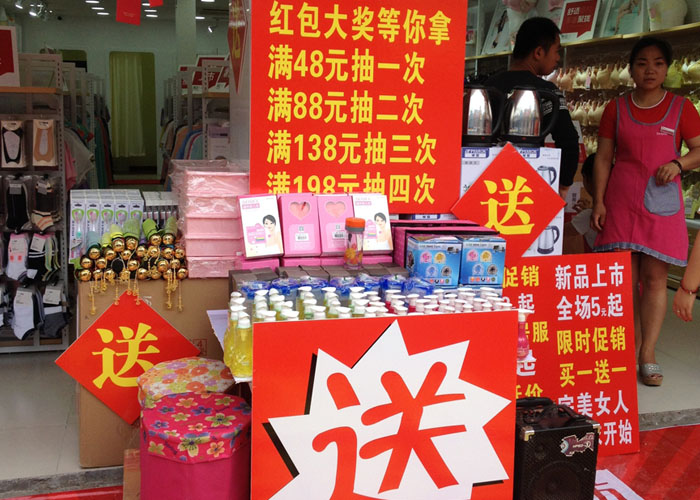 大气的外场,祥和的彩球围绕店面飘扬,大大的红包飘荡在门口欢迎顾客的到来,缤纷多样的礼品和着各种的抽奖机制诱惑全场。