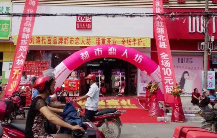 广西美丽的北部湾,钦州海豚之乡浦北县,迎来都市恋人坊内衣专卖店的驻入!与都市恋人坊内衣专卖店合作之人是经商数载的张总。张总是拥有十几家品牌鞋店的老板,在朋友的推荐下,与都市恋人坊结缘!经过多次考察,了解到公司有特殊五维服务后,最后决定与公司签订,忙碌了十几天的装修后,于8月20日正式开业!由于当地对市容严查,开业外场有阻碍,所有外场限制苛刻,只能摆上小外场。