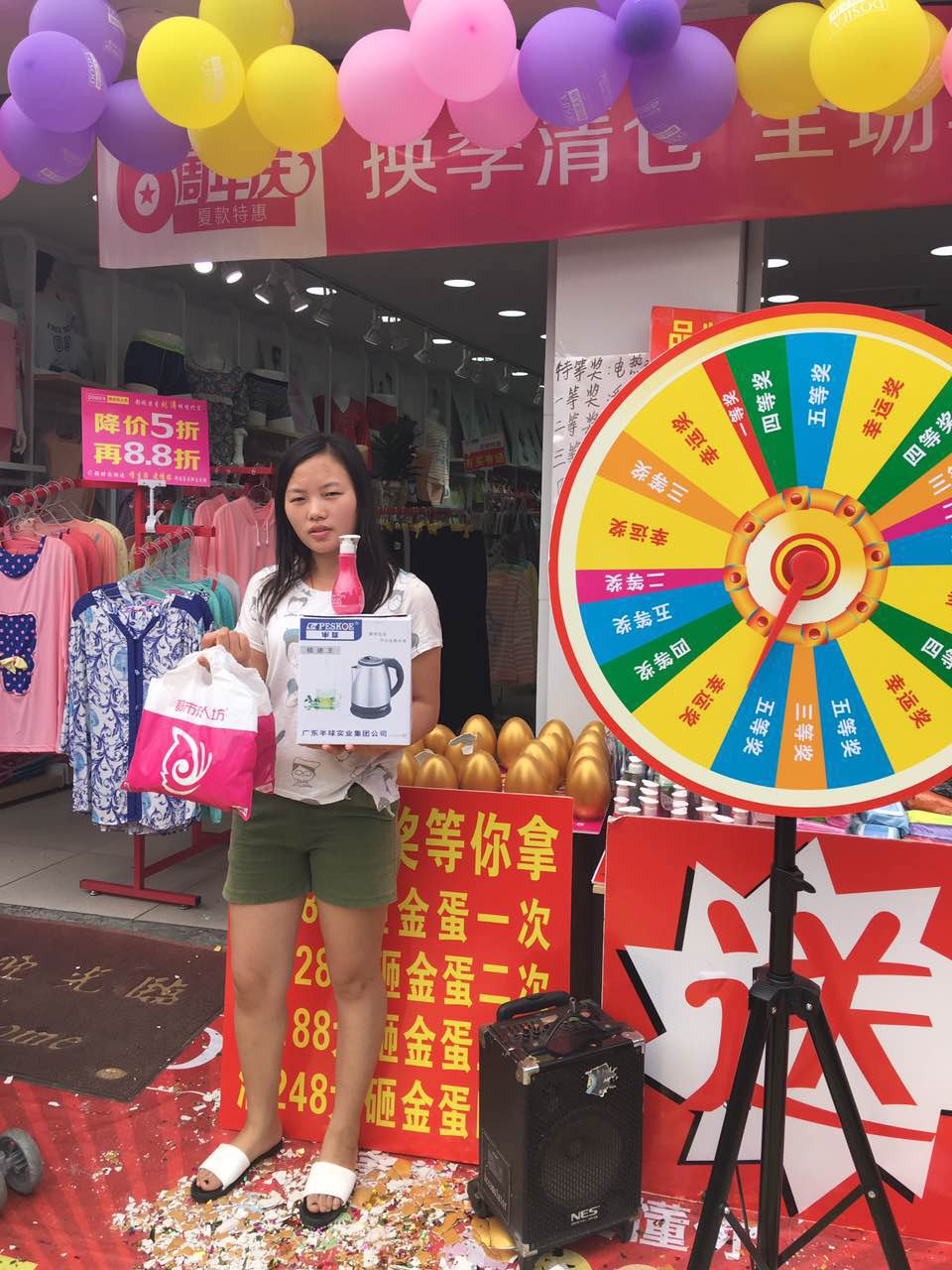 下图为当天活动现场一位幸运的顾客举起发财的手一击砸重我们今天的特等大奖电热水壶一台。