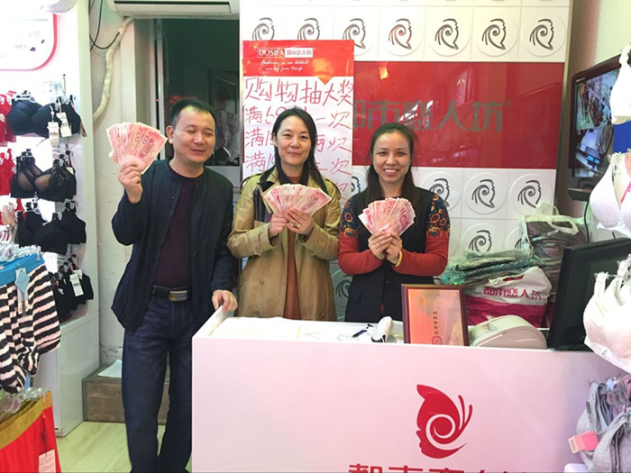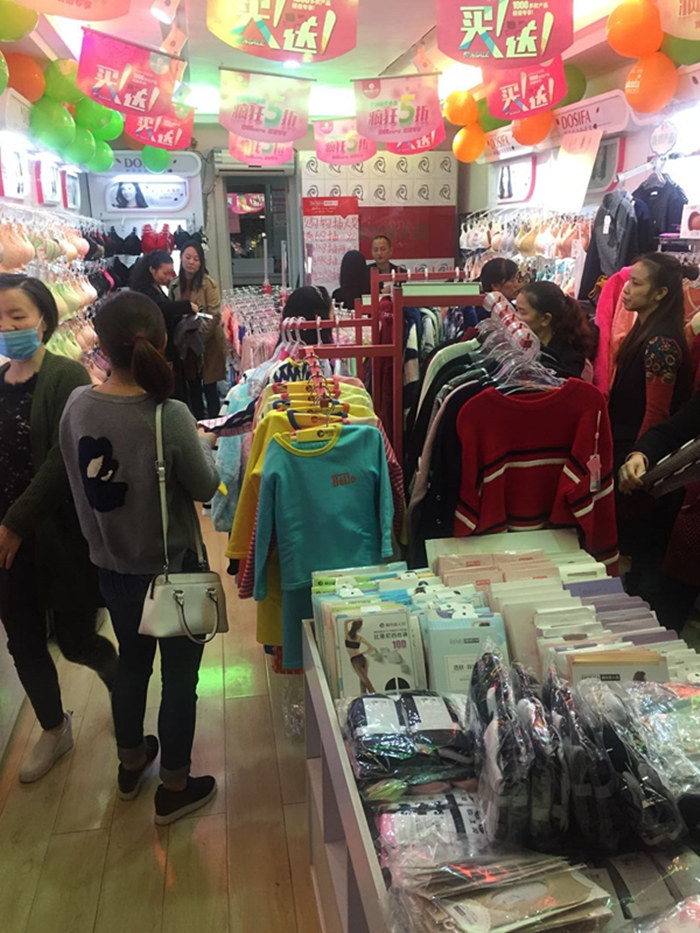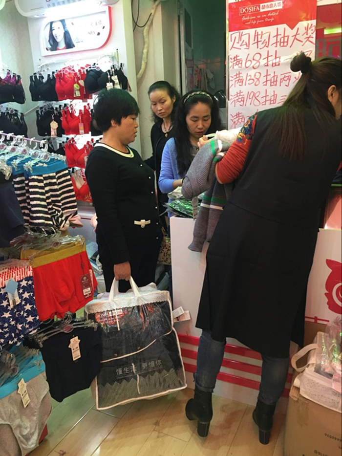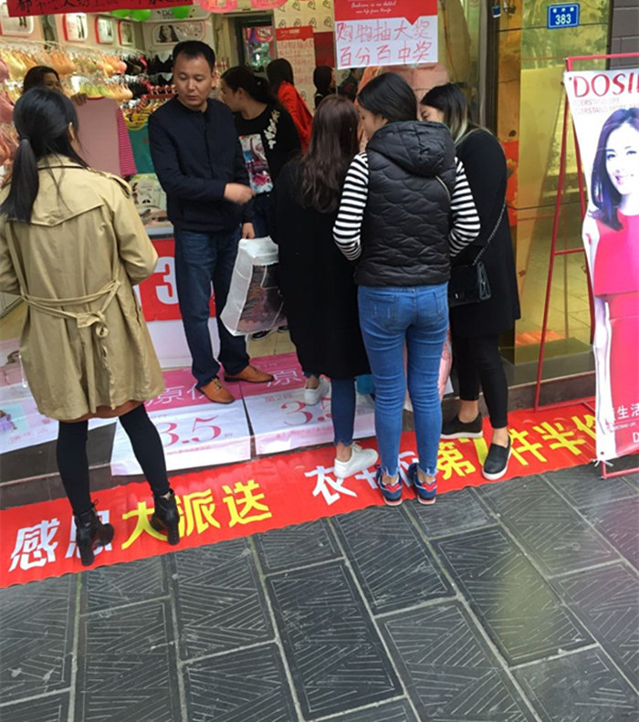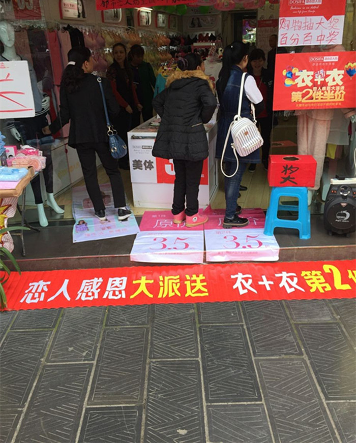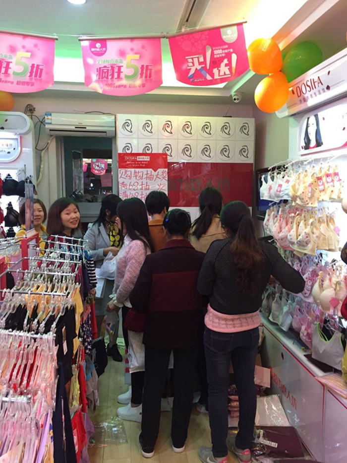 焦老板的店就在这么一个美丽,盛产茶叶的地方,焦老板还经营有其他生意,药店,宾馆等等不在话下,活动这天不是周末,但是恰好国庆高温过后的首次降温,这天天气冷飕飕,街上的人好多都穿着棉衣了,哈哈。。。我们知道旺季来临了,保暖,美体衣,法兰绒睡衣要大卖了,早早的我们就开门布置外场,还没弄好呢来买东西的人就开始络绎不绝了。我们购物大抽奖,抽抽抽,抽出好运来。果不其然,我们的活动火爆得不得了,到了晚上九点都还在排队买单。来看看我们的火爆现场吧