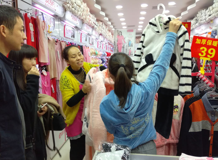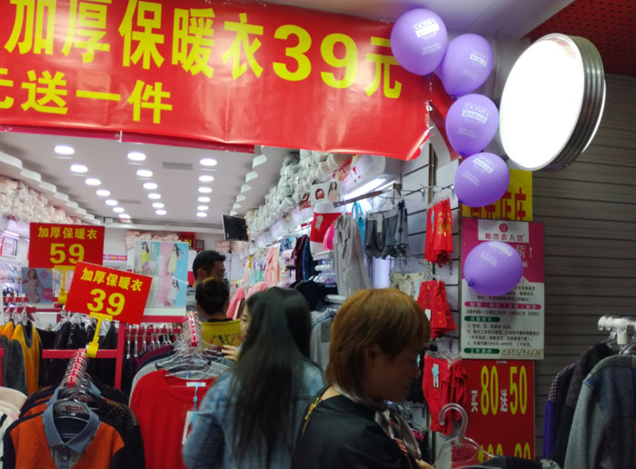 赵总的店位于上海浦东祝桥镇,活动当天,天气正处于秋冬交替气温下降的日子里,督导做好内外场的氛围布置,培训好门店店员当日的活动细节,随着热烈的喊麦声音,吸引了大量路过的顾客进店选购冬季保暖的商品,在微冷的秋风中,热情的喊麦声和大量顾客挑选商品的声音在这街道上传的很远,很远! 接下来就让我们看看当天热卖的现场吧!看看赵总大姐夫妻俩忙碌的身影!