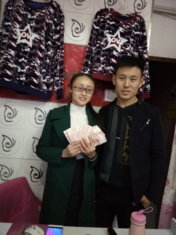 一整天旁边的都市丽人、浪漫春天都在干着急啊,而我们的辛苦还是得到了回报的,晚上看了下业绩,竟然高达6627元,再一次告诉我们旺季真的来了。下面我们来认识一下我们的曹美女和她老公。