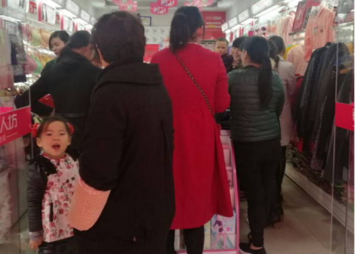 音乐响起来,特价保暖59元一套,豪礼送不停,豪礼送不断!从早上到晚上人潮涌动,小小的店铺里满满的都是人,保暖夹棉一套接着一套,大单一个接一个。