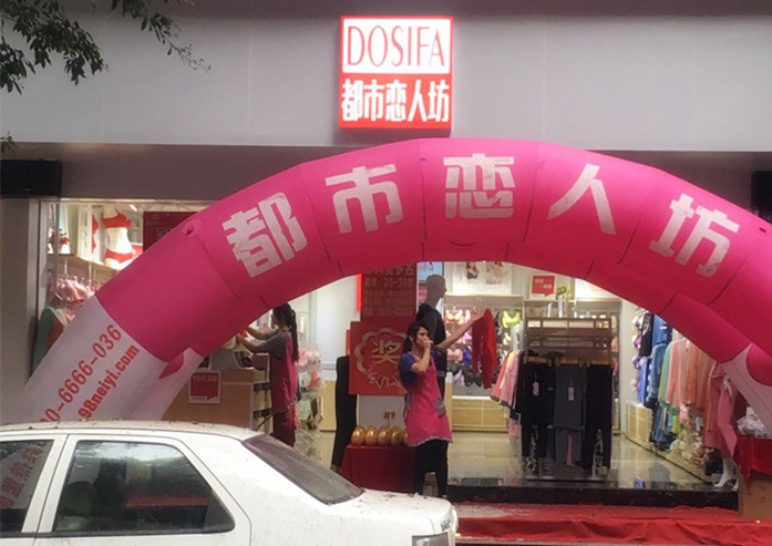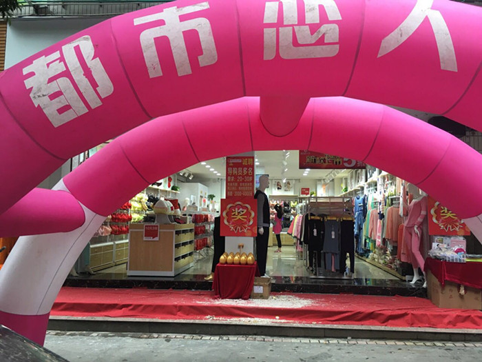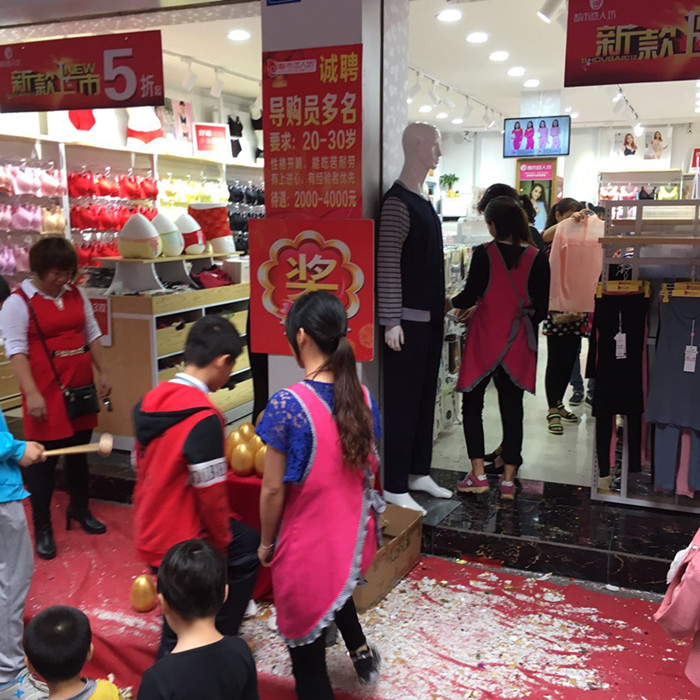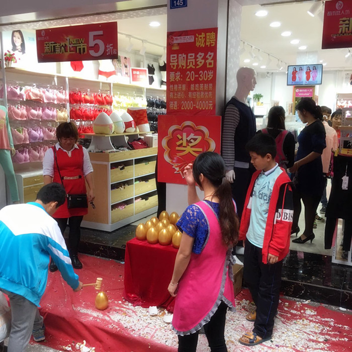 大埔县是广东省梅州市下辖县。地处广东省东北部,韩江上游,大埔县先后荣获“中国蜜柚之乡”、“中国名茶之乡”称号,西岩乌龙茶和大埔蜜柚被认定为国家地理标志保护产品。梅州大埔黄老板浙江温州人,十几年前来到梅州大埔做男装、鞋子生意,2014年转行做内衣加入都市恋人坊大家庭。当天活动主题是砸金蛋送好礼:买满88元砸一次、买满168元砸两次、买满228元砸三次……,气派的四足拱门,鲜艳的红地毯、金色的大金蛋将整个外场烘托的大气、喜庆。