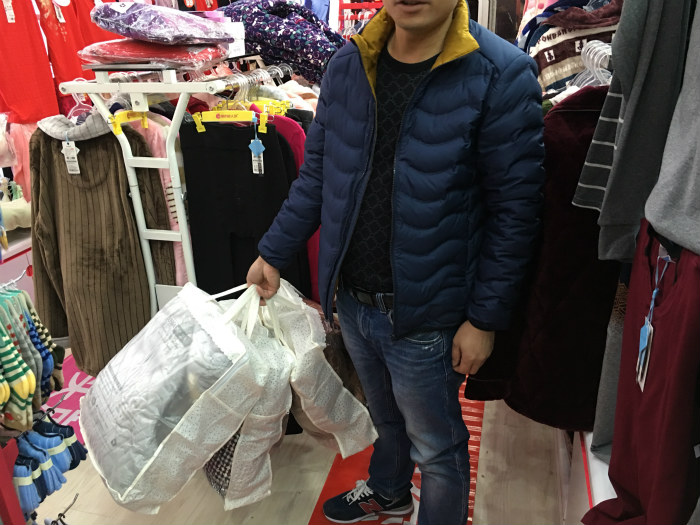 晚上7点路上已经没有人了,徐姐也在收拾东西准备关门了,正巧又有一位大哥走进了我们的店铺,在徐姐的介绍下直接拿下三套夹棉!