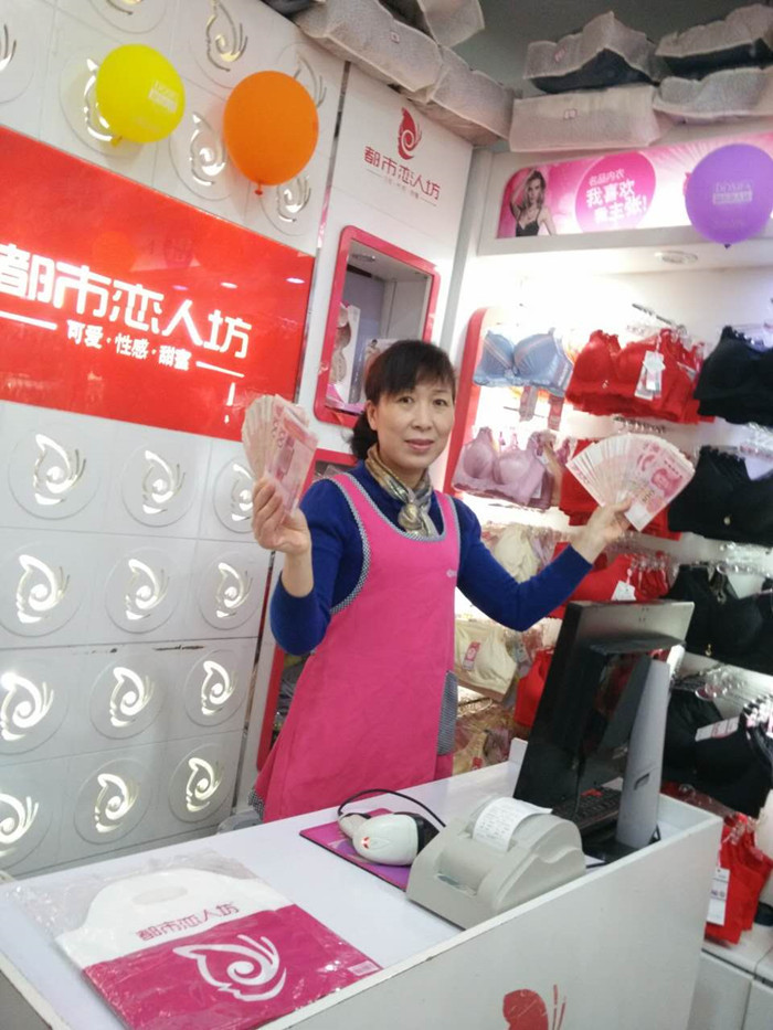周姐是2012年通过地面招商加入到都市恋人坊的,之前从事内衣导购接近10年,对内衣行业的各个方面都比较熟悉,经过网络与实体店考查,最后认定都市恋人坊的发展空间最大!3年内果断连开了2家店!今天我们的活动主题是“迎双旦,购物送苹果,全场3.5折起”。走过路过的只要看到这样的活动,都会进店看看!先来看看我们时尚的产品吧!