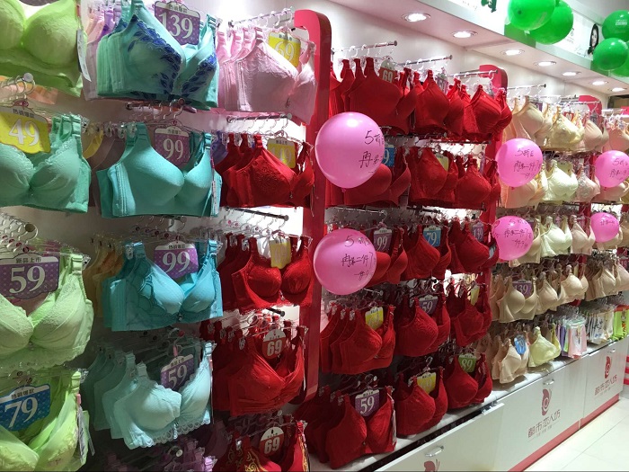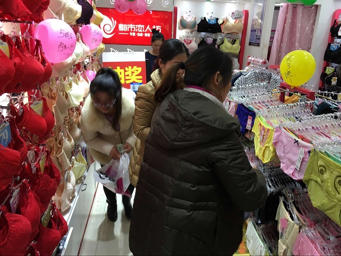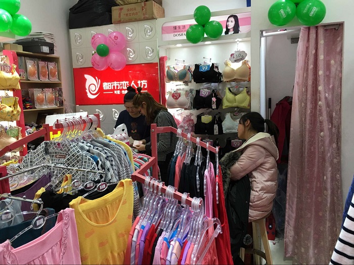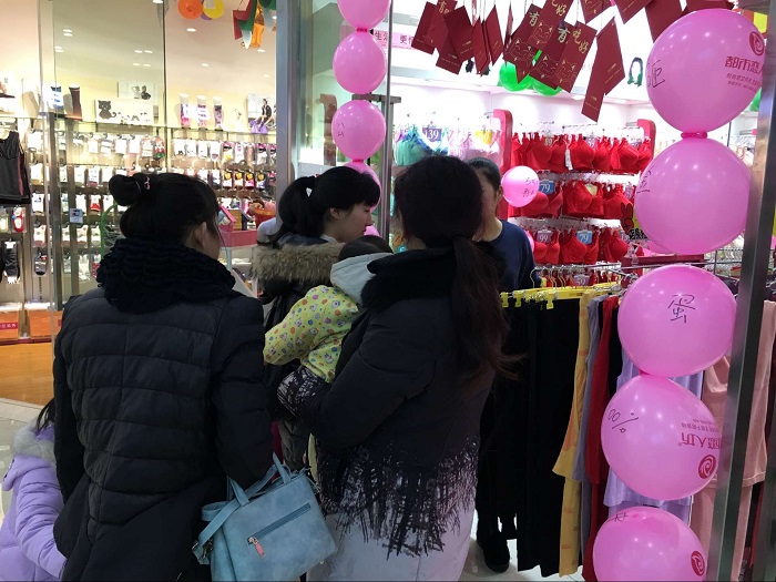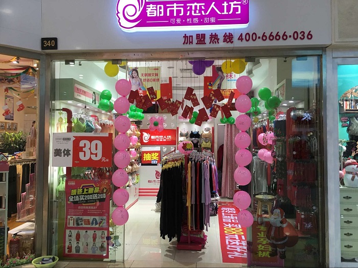 朱姐名下经营3家袜子专卖店,一直想进军内衣行业的她于2014年通过地面招商与都市恋人坊结缘了。经考察以及综合评估,认定都市恋人坊最具有发展前景!今天我们的活动主题是“元旦大派送,购物砸金蛋,全场10元热卖”,先来看看我们霸气的外场和内场的形象和产品吧!