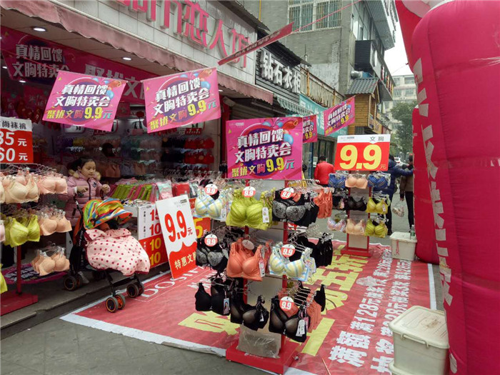 当货品到店,我们提前去到店铺活动布场及广告物料准备,客户玲姐非常配合:准备了4个内裤中岛架陈列文胸,此次活动主题:“真情回馈 文胸9.9 内裤1元”,活动内容:文胸特卖会精品文胸9.9,购新品文胸+1元换购价值16元内裤一条。